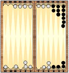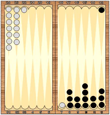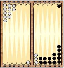 Белым надо пройти 15 позиций (от пункта 7 до пункта 22), т.е. 2 хода. И 7 ходов на выброс, итого 9 ходов. Вроде бы равенство. У черных 10 ходов, но они ходят первыми, а у белых 9 ходов. Исходя из этого, смело делаем оценку, что шансы на ойн у обеих сторон 50%.