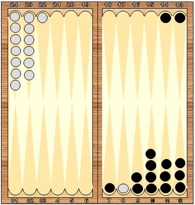 Первый ход бел ых. Шашке с пункта 13 до пункта 10 надо пройти 22 позиции, это – три хода (напомним - средний ход в длинных нардах 8.17). Еще на выброс 15 шашек нужно в среднем 7 ходов, предполагая, что один из них (по статистике) - куш. Итого – 10 ходов у черных. Эта цифра практически неизменная во всей задаче. Фиксируем ее.