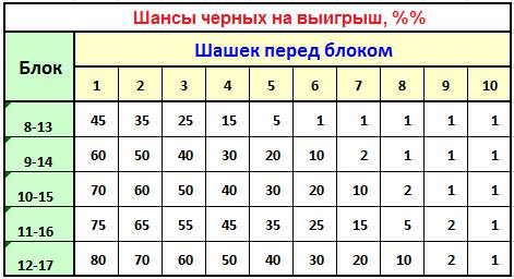 3. Каждая новая белая шашка увеличивает шансы черных примерно на 10 %. Т.е. 2 белые шашки (в пункте 8) – почти равные шансы, 3 белые шашки – черные впереди – около 60%, 4 шашки белых – около 70 выигрыш черных, 5 шашек – 80%, 6 шашек 90% и т.д.