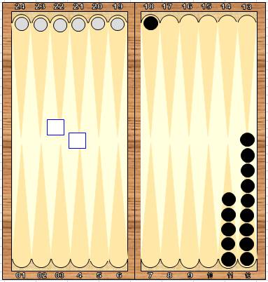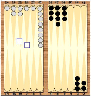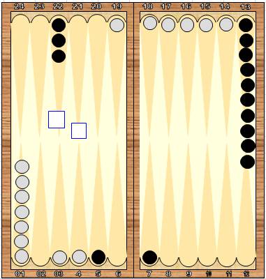 Начиная с этого момента надо выбрасывать только шашки, которые не открывают ни одного пункта, т.е. те, под которыми еще есть ваша шашка (в приведенной выше позиции это шашки на пунктах 22 и 23). В первую очередь выбрасываем такие шашки с пунктов 20-24, отдавая предпочтение тем, которые ближе к пункту 24. С пункта 19 ходим шашки, когда бросок – 6 или больше нет шашек, не открывающих пункты. Когда открывание пунктов становится неизбежным, открывайте, начиная с 19, потом 20 и далее. При этом по-прежнему, выбрасываем только «лишние» (не открывающие пунктов) шашки или открываем пункты в последовательности 19, 20, 21 и далее.