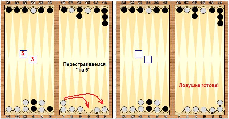 Для построения ловушки «на 6» очень эффективны перестановки шашек в своем доме.