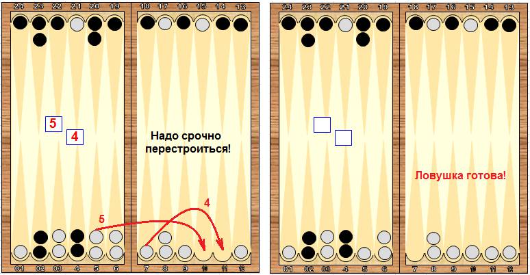 Прием критически чувствителен к моменту ухода блока ваших шашек из чужого дома.Если в этот момент у вас будет 3-4 мелких броска, скорее всего выиграет соперник;