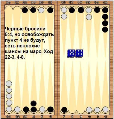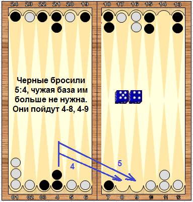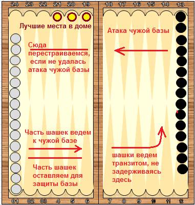 Все более-менее ясно в том случае, когда не удалось сколь-нибудь много пунктов занять в чужой базе (1 или 2 пункта). В этом случае нужно стремиться быстро занять в своем доме лучшие места (это 6, 5 и 4 на выбросе), можно при этом даже пожертвовать позициями в базе соперника и переместить их в дом. Достаточно, как правило, даже одной шашки в базе, которая при этом становится «мостиком» в дом и никаких других функций не выполняет.