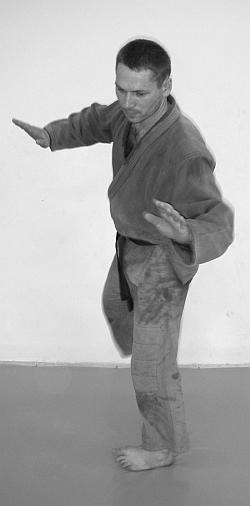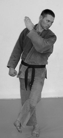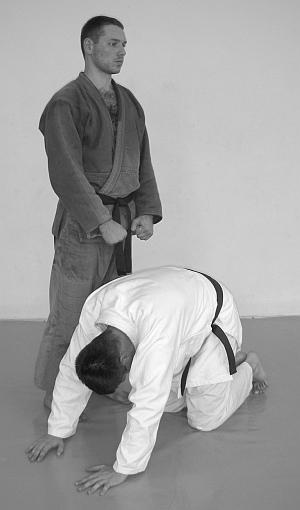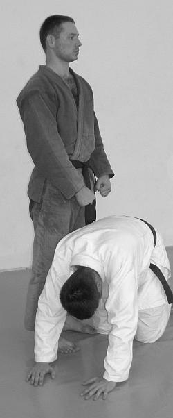1. Исходное положение: помогающий располагается на четвереньках. Голова опущена. Отрабатывающий технику становится сбоку, лицом к нему. Левая рука захватывает отворот кимоно сзади – фото 29—30.