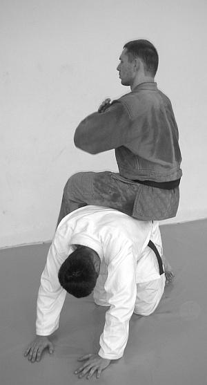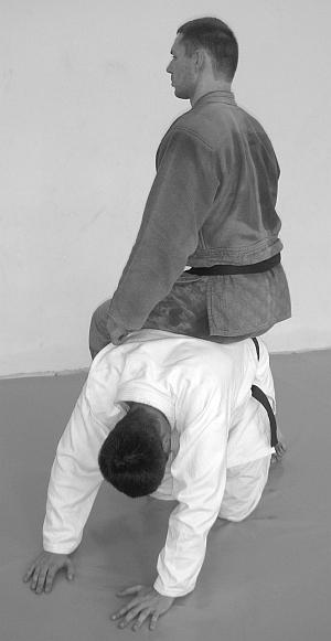 1. Исходное положение: помогающий располагается на четвереньках. Голова опущена. Отрабатывающий технику подходит к нему сбоку и садится на спину помогающему – фото 25—26.