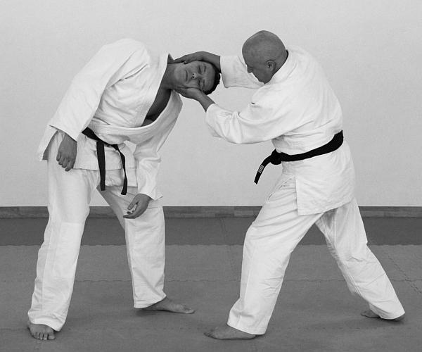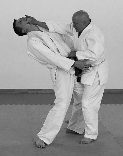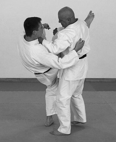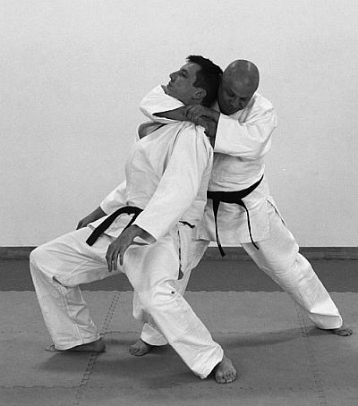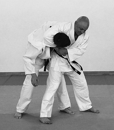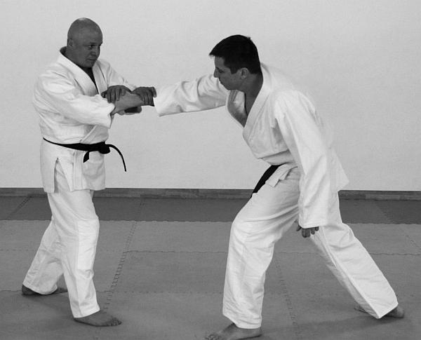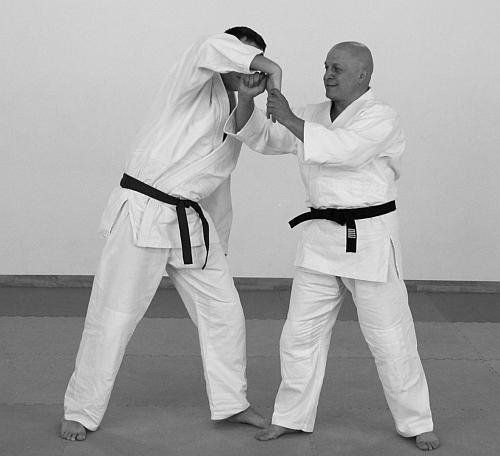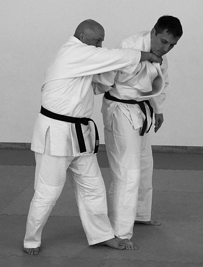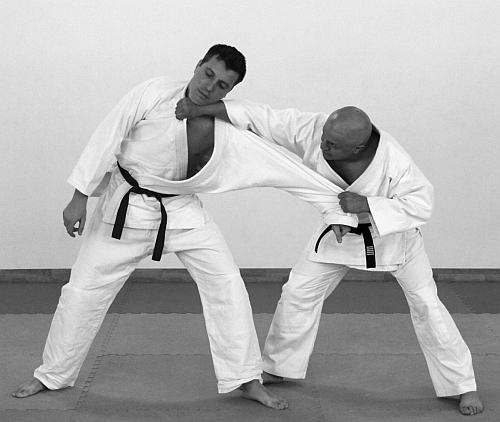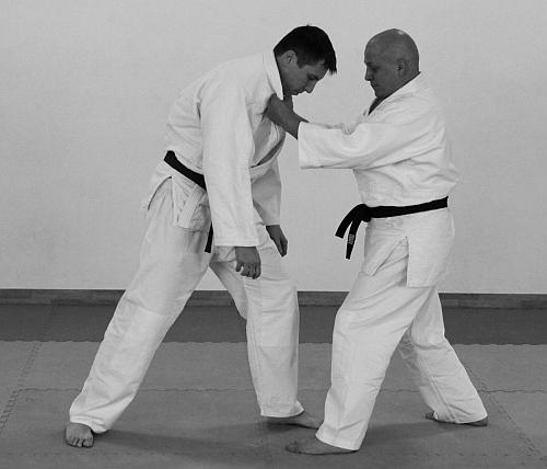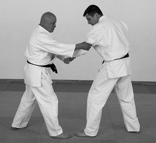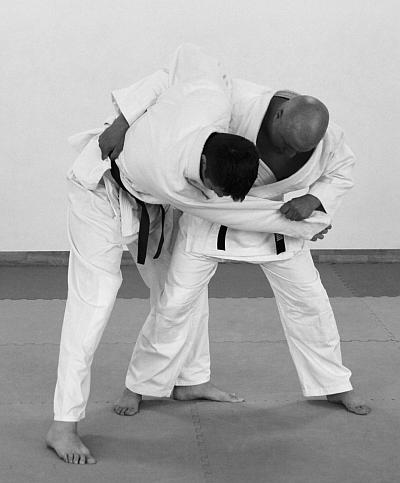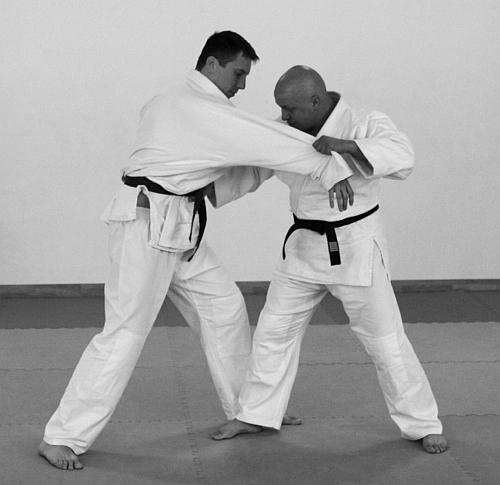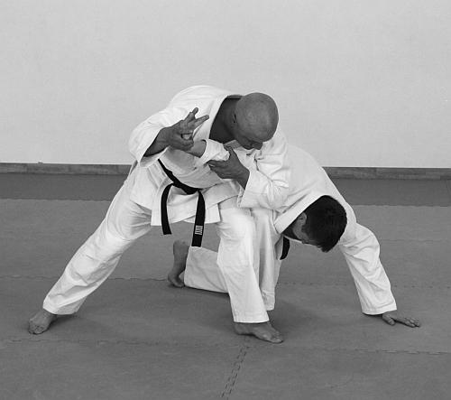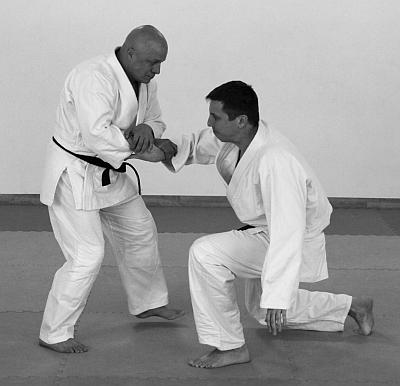 Комбинированный захват противника при подходе сбоку, правой рукой на удушающий прием за разноименный левый отворот кимоно, левой рукой болевой захват – загиб локтя за спину. Захват производится с целью управления противником и позволяет в любой момент бросить его на землю опасным способом – фото 60.