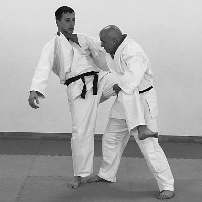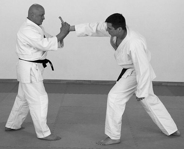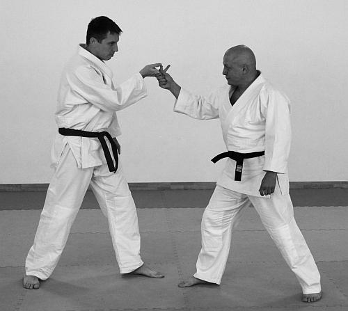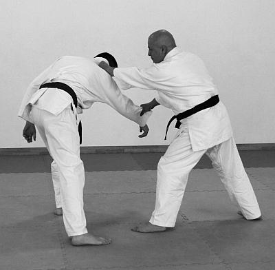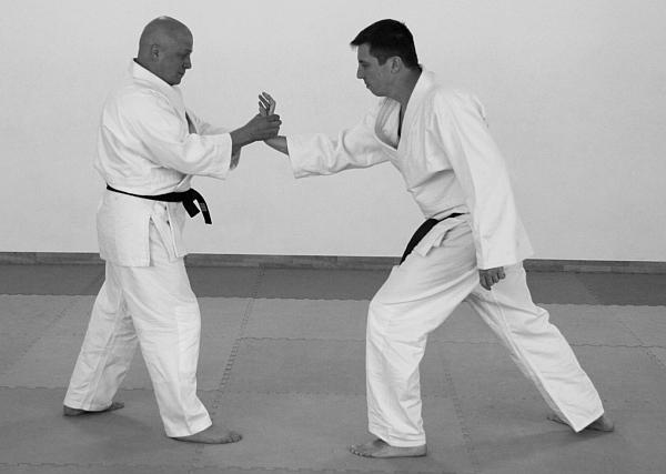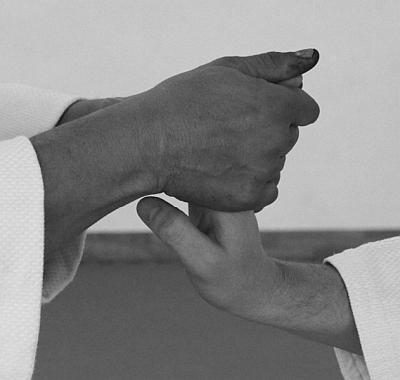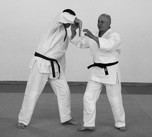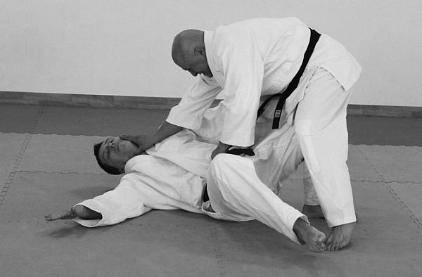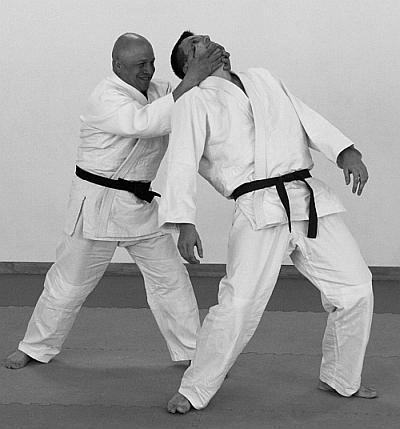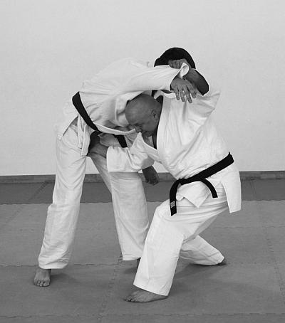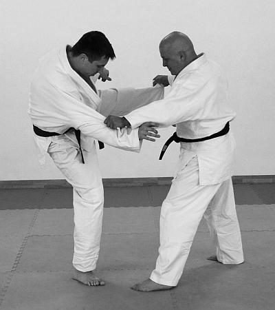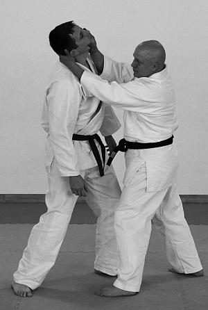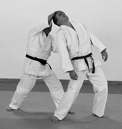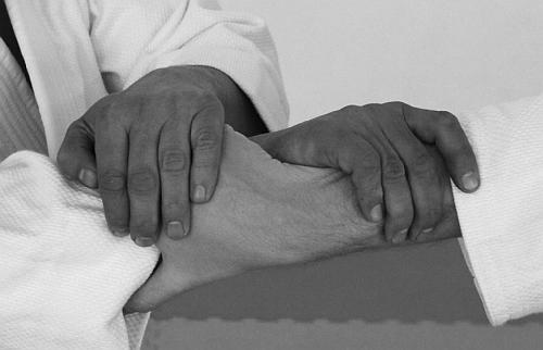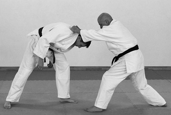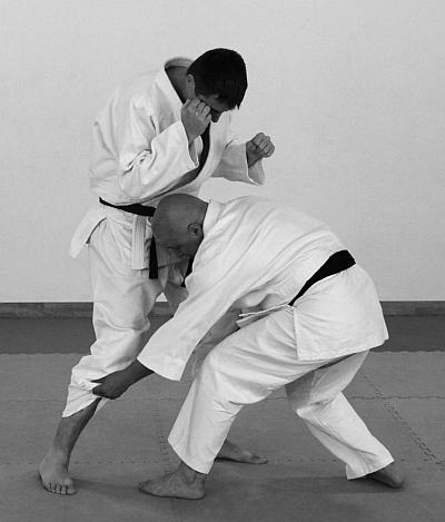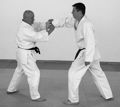 Комбинированный захват противника при подходе сбоку, правой рукой на удушающий прием за разноименный левый отворот кимоно, левой рукой болевой захват – загиб локтя за спину. Захват производится с целью управления противником и позволяет в любой момент бросить его на землю опасным способом – фото 60.