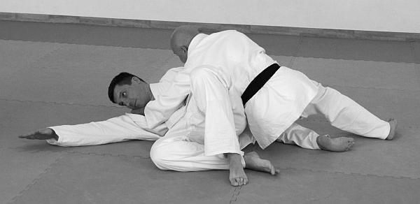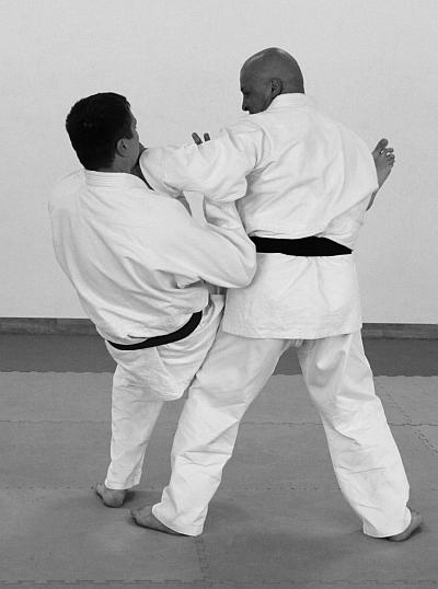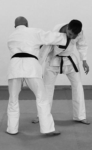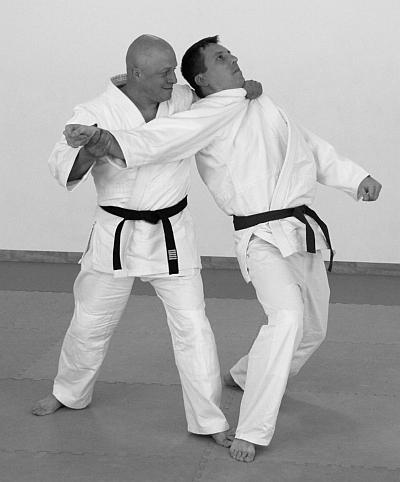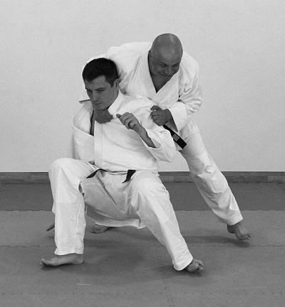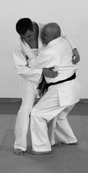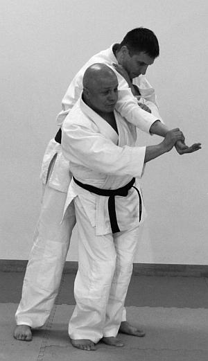 Комбинированный захват противника при подходе сзади. Левой рукой удушающий захват за разноименный правый отворот кимоно. Правой рукой захват на болевой прием (рычаг локтя через грудь) за кисть правой руки. Захват производится с целью управления противником и позволяет в любой момент бросить его на землю опасным способом – фото 61.