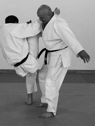 3. Комбинированный захват противника левой рукой за одноименный отворот кимоно противника, подхват правой рукой его правой ноги. Бросок разнонаправленным движением рук опрокидыванием противника на спину – фото 81 — 85.
