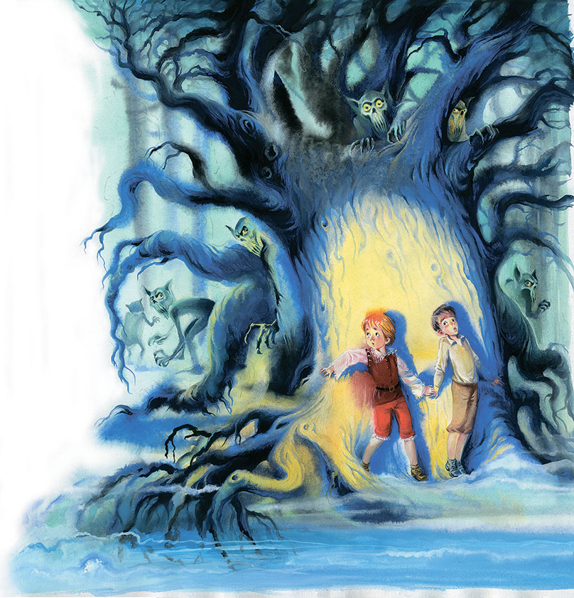 А чёрные стражники всё приближались и приближались. Мы словно застыли в ожидании. Но тут случилось нечто необычайное. Сухой ствол мёртвого дерева вдруг раскрылся, обнажив перед нами дупло! Мы с Юм-Юмом торопливо втиснулись в него и замерли, дрожа от страха, как пара птенцов при виде ястреба. Теперь стражники были совсем близко, мы могли разобрать каждое их слово.
