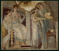 На этой стенописи из Геркуланума изображены женщины за туалетом. На шее у матроны (она в окружении дочерей и рабыни) - ожерелье, - плетёное из золота со вставками изумрудов и перламутра.