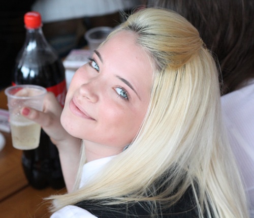 Итак, возьмемся за довольно простую ретушь портрета: в наличии мы имеем фото, которое прислал наш пользователь Kislik, портрет очаровательной блондинки с бутылкой Кока-колы и пластиковым стаканом шампанского — наша задача сделать из него такое, которое не стыдно показать родителям, если мы правильно поняли. Kislik просил еще фон заменить, мы посмотрим, что можно с этим сделать, но название нашего урока этого не предполагает.