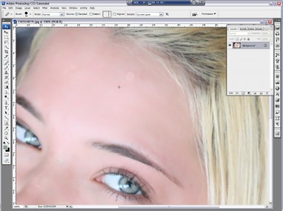 Есть два подхода, как их замазывать, до или после эффектов. Мы будем до. Берем «пластырь» и копируем (нажав Altс кликом на аналогичной точке) кусочки кожи с хорошего места на плохое. Замазать недостатки кожи (прыщи или морщины, например) несложно, просто терпение нужно. Точно так же выравниваем мешки под глазами или бледность там же (под правым глазом, который у нас слева, явная синева) — достаточно режим пластыря изменить с «нормального» на «цвет».