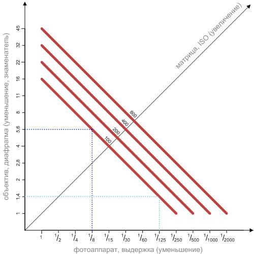 Итак, на графике вы видите взаимозависимость всех трех параметров экспозиции. Сначала поясним, что к чему: