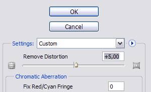 Затем Выбираем пункт меню: Filter/Фильтры > Distort/Искажение > Lens Correction/Оптические искажения, в результате чего появляется окно с многочисленными основными настройками, из которых нам нужен только верхний блок справа, сразу под клавишами: