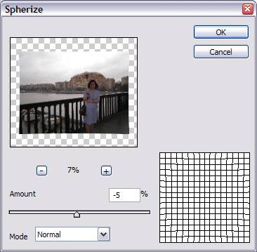 Есть, однако, небольшая проблема: фильтр появился только в последней версии, CS2. Если вы пользуетесь более ранними версиями фотошопа, увеличьте на 30% размер холста ( Image/Изображение > Canvas Size/Размер холста > в процентах 130 по вертикали и горизонтали) и откройте Filters/Фильтры > Distort/Искажение > Spherize: