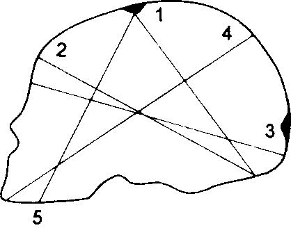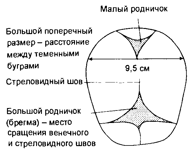 — малый косой размер — расстояние от подзатылочной ямки до переднего края большого родничка. Головка плода прорезывается окружостью, соответствующей этому размеру, при переднем виде затылочного предлежания; 2 — средний косой размер — расстояние от подзатылочной ямки до границы волосистой части лба (10,5 см). Прорезывающаяся окружность, соответствующая этому размеру, встречается при заднем виде затылочного предлежания; 3 — прямой размер — затылочно-лобный диаметр (11, 5 см). При переднеголовном предлежании головка плода прорезывается окружностью, соответствующей этому размеру; 4 — большой косой размер — расстояние от подбородка до верхушки черепа (13 см). При лобном предлежании головка плода прорезывается окружностью, соответствующей этому размеру; 5 — вертикальный размер — расстояние от подбородка до середины большого родничка (9,5 см). При лицевом предлежании вертикальная окружность— прорезывающаяся.