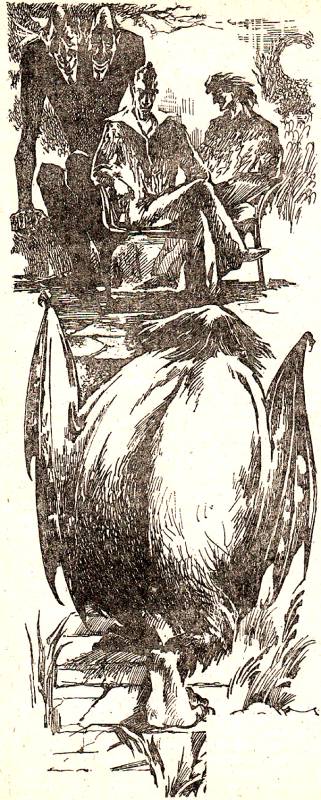 Атос, Арамис и флагман Макомбер сидели на веранде за столом, тут же на перилах восседал Двуглавый Юл, весь, от обеих шей и до ступней, затянутый в трико цвета яичного желтка. Он яростно вращал своими тремя глазами и хрипло орал в две глотки, распространяя в свежем солоноватом воздухе сернистые испарения:
