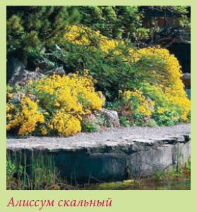Алиссум скальный – Alyssum saxatile Довольно высокий (около 35 см), но имеет и карликовые сорта (например, «Сотрасtum» – 15 см, «Citrinum»—25 см).