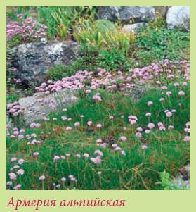 Из-за травянистых густых, сохраняющих свою зелень и зимой розеток армерия хорошо вписывается в группы крупных стелющихся растений. Хорошо сочетается с камнеломками, седумами, низкими ползучими флоксами, колокольчиком карпатским, ясколкой, тимьяном ползучим.Армерия альпийская – Armeria alpina = Armeria maritima