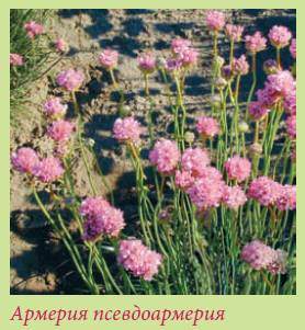 Армерия псевдоармерия – Armeria pseudarmeria Растение с сильными стеблями до 40 см высотой. Образует компактные вечнозеленые розетки зеленых линейных листьев. Стебли округлые, жесткие, прямостоячие. Соцветия шарообразные из мелких цветков белого или розового цвета. Массовое цветение приходится на июнь, отдельные цветки появляются до октября. Длительное цветение и привлекательная листва делают растение подходящим для выращивания в каменистых садах и в контейнерах, превосходно для срезки и зимних букетов. Для успешного выращивания необходимо открытое солнечное место и песчаная почва с хорошим дренажем. Морозостойко. В сырую зиму возможно загнивание корневой шейки и гибель растения.