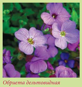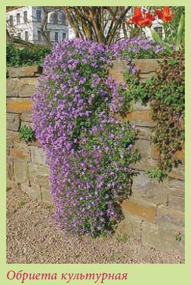 ОБРИЕТА, или АУБРЕЦИЯ – AUBRETIAЕсли вы, попав на свой участок весной, не хотите любоваться прошлогодней рыжей травой и первыми ростками многолетников среди проталин, разведите в саду обриету, и тогда перед вами откроется поистине сказочная картина – яркий красочный ковер из розовых, малиновых, фиолетовых цветков. Из-за их обилия не увидишь ни одного листочка. Одно из самых больших достоинств обриеты – она зимует с листьями. Необыкновенно хороши уже ранней весной, когда сойдет снег, ее сизые изящные куртинки. Листья сохраняют свою окраску и после поздневесенних и ранних осенних заморозков, не повреждаются даже сильными морозами. Она хороша и как каскадное обильноцветущее растение, цветет в мае-июне.