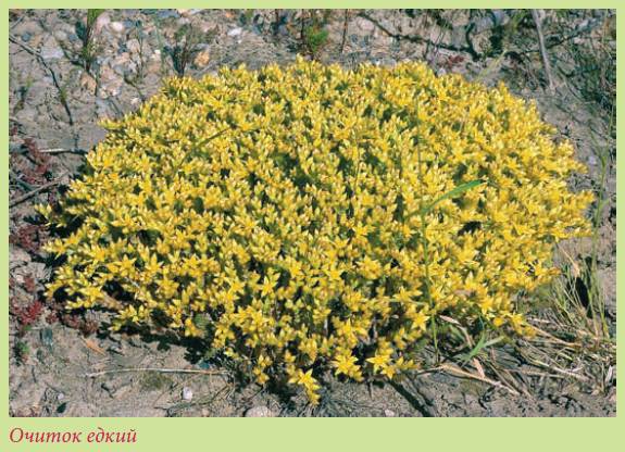 Семейство Толстянковые. В культуру очиток введен сравнительно недавно, но сразу привлек внимание цветоводов способностью нормально цвести и размножаться как в тени, так и на солнце, на сухих каменистых участках и на влажных глинах. К тому же это растение не болеет, не страдает от засухи и заморозков и привлекательно выглядит круглый год. От поверхностного ползучего корневища отходят прямые стебли высотой 5—10 см, которые укореняются в каждом узле и вместе с плоскими, округлыми, как у всех суккулентов, утолщенными листьями образуют такой плотный покров, что по нему можно ходить, не боясь повредить. Над покровом в июне поднимаются многочисленные зонтиковидные соцветия из розовых цветков. В июле – августе созревают многочисленные мелкие семена, которые весной прорастают и образуют массовый самосев.
