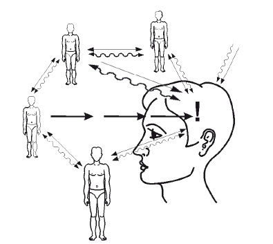 Соответственно, в обществе наряду с легко осознаваемым слоем словесного и несловесного общения существует слабоосознаваемый информационный заражающий слой не связанных с опытом каждого и непроизвольно передающихся эмоциональных векторов. Он оказывает влияние на эмоциональный фон в общем и участвует в формировании закрепляющихся в памяти человека значений понятий, особенно если они дублированы словами. Этот слой в очень малой степени управляется отдельным человеком, он рождается только группой и охраняет информацию от искажения. Это нити взаимодействия, информационная паутина в энергетических полях.