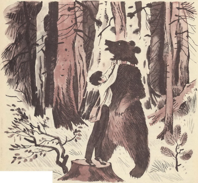 Однако медведь непонимающе смотрел на него и не двигался с места. Он привык провожать своего друга до лисьей поляны.