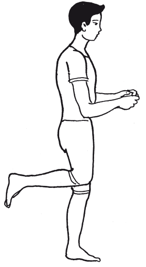 Согните правую ногу в колене под углом 90 градусов и отведите ее назад. В этот момент присядьте на левой ноге, приподняв перед собой руки, и сделайте вдох (рис 13). Примите исходное положение – свободный выдох. Теперь на вдохе согните левую ногу, отведите ее назад и присядьте на правой. Выдохните, выпрямляя ноги.