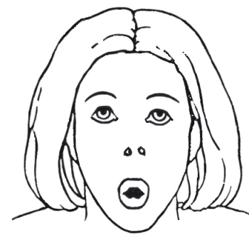 Выполните весь дыхательный цикл (5 этапов), после чего соберите губы в трубочку и широко откройте глаза, подняв их вверх (рис. 15, б ). Одновременно напрягите щеки и носовую область и высуньте язык, не расслабляя губы (рис. 15 , в ). Сохраняйте позу в течение 8 секунд. Упражнение повторите 5 раз.а
