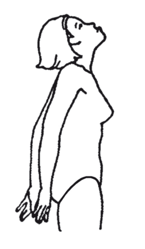 Высоко поднимите голову, сохраняя исходное положение. Представьте, будто кто-то тянет вас за макушку вверх (рис. 16 , а ). При правильном выполнении вы почувствуете, как растягиваются мышцы от кончика подбородка до самой грудной клетки.
