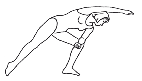Выполните дыхательный цикл. Затем слегка присядьте, копчик втяните в себя, перенесите вес тела на левую ногу, а правую – вытяните в сторону, развернув носок наружу. Ступню от пола отрывать нельзя. Одновременно левую руку опустите так, чтобы локоть уперся в согнутое левое колено, а правую руку поднимите над головой и потяните в сторону (рис. 17, б ). При этом вы должны почувствовать, как тянутся боковые мышцы от талии до подмышечной впадины. Задержите позу на 8 секунд. Повторите движение в другую сторону. Снова задержитесь на 8 секунд. Упражнение следует выполнять по 3 раза в каждую сторону.а