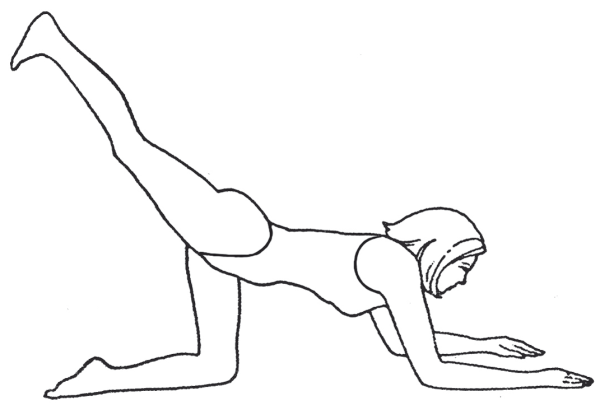Вытяните правую ногу назад так, чтобы она упиралась носками в пол. Тяжесть тела при этом находится на локтях и руках, которые лежат прямо. Поднимите голову, посмотрите прямо перед собой (рис. 18 , а ). Затем выполните 5-этапное дыхание, втяните живот и примите исходное положение.