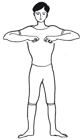 Исходное положение: встаньте прямо, руки согните в локтях и поднимите на уровень плеч так, чтобы кисти почти соприкасались, а локти смотрели в стороны (рис. 9, а ).