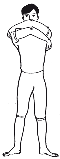 Делать это упражнение следует очень осторожно. Начиная с небольшого количества раз. Во время шумного вдоха обнимите себя за плечи только так, чтобы руки были параллельно друг другу, а не крестнакрест (рис. 9, б ). Во время выдоха руки разведите в стороны, немного не доходя до И.п. При этом руки не должны быть напряжены, разводить очень широко их также не следует. После нескольких недель тренировок, когда упражнение будет доведено до совершенства, немного усложните его. Во время шумного вдоха обнимите себя за плечи и откиньте голову назад. На выдохе вернитесь в исходное положение.