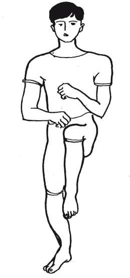 Поднимите согнутую в колене под углом 90 градусов правую ногу до уровня живота. В это время слегка присядьте на левой ноге, приподняв руки перед собой, и сделайте вдох. На выдохе примите исходное положение. Теперь поднимите согнутую левую ногу. В это время слегка присядьте на правой и сделайте вдох. На выдохе выпрямите обе ноги. Спина при этом должна оставаться прямой (рис. 12). Этот танцующий передний шаг напоминает движения «рок-н-ролла».