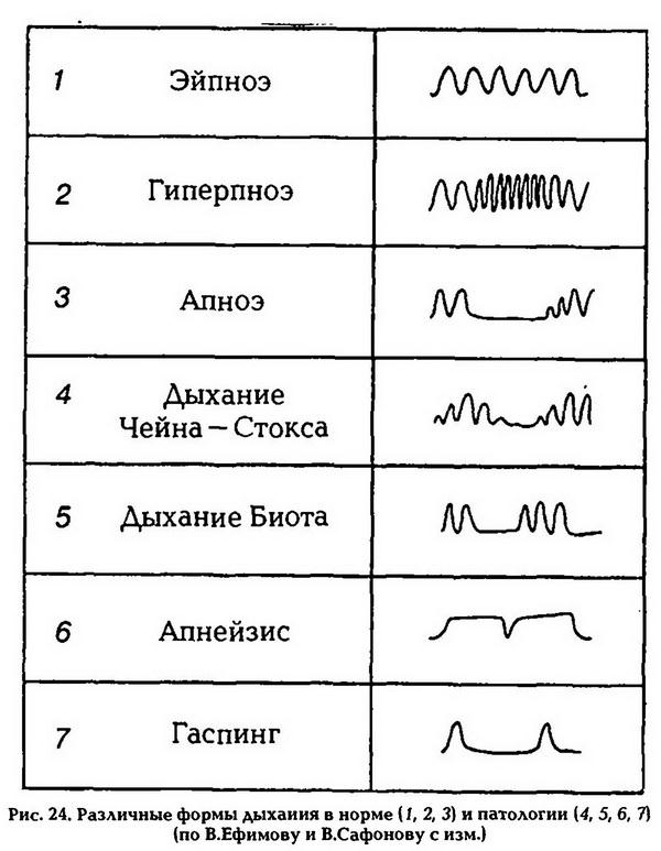Паттерн дыхания существенно меняется при нарушении функции структур мозга, участвующих в регуляции процесса дыхания, а также в условиях гипоксии, гиперкапнии и при их сочетании (рис. 24).