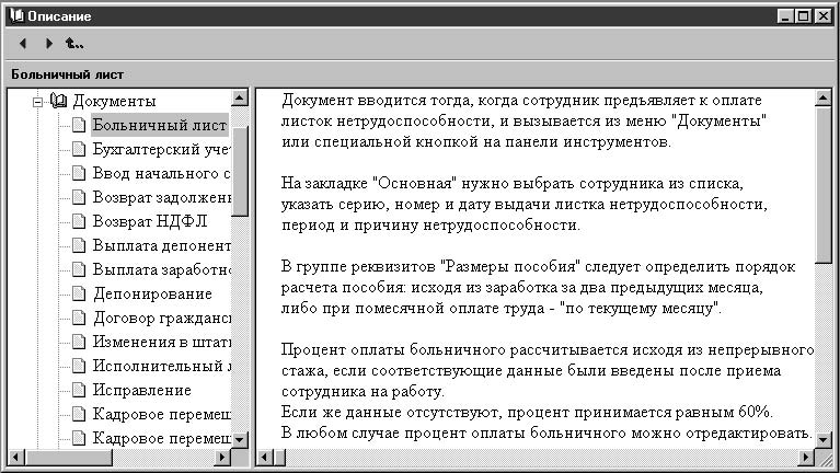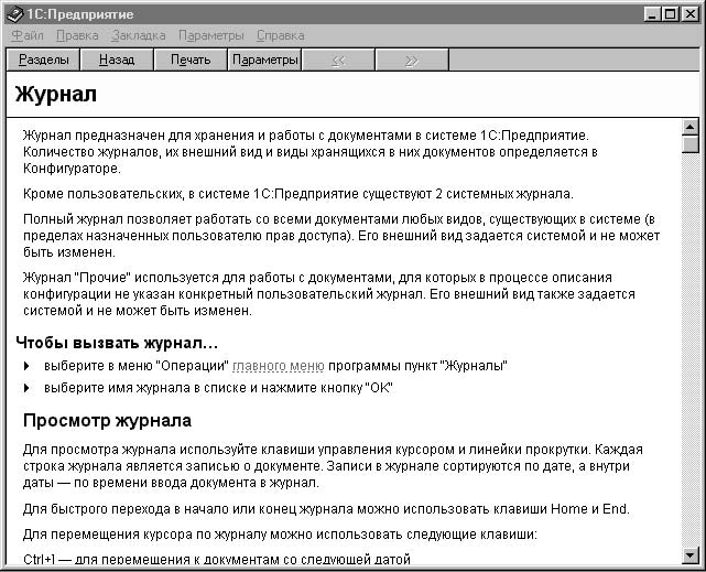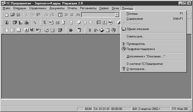 Справочная система программы помогает пользователю сориентироваться в обилии кнопок на панели инструментов для задания необходимых действий, а также описывает смысл вводимой информации. К сожалению, в справочной системе нет описания последствий пропуска тех или иных реквизитов справочников или документов. На первый взгляд кажется, что многие реквизиты надуманные или вообще не нужны, и пользователь пропускает их. Это может привести к недоразумению при заполнении документов или подведении итогов. В описании основных компонентов программы мы будем рассматривать такие реквизиты особенно внимательно. Все виды описаний можно получить из меню Помощь (рис. 2.1).