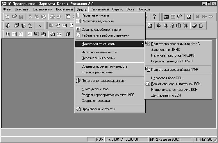 В предложенном списке отчетов присутствуют специфические нормативные отчеты, которые требуются в аудиторских проверках и налоговых инспекциях. Это отчеты группы Налоговая отчетность (рис. 1.4). Названные отчеты подытоживают первичные документы и являются показателем корректности ведения учета заработной платы. Отчеты, сформированные программой для пенсионного фонда и налоговой инспекции на внешнем носителе, являются рабочими документами для этих органов. Особенности формирования этих и других отчетов мы рассмотрим в главе 7 . Сформировать необходимый отчет вы можете в меню Отчеты (рис. 1.4).