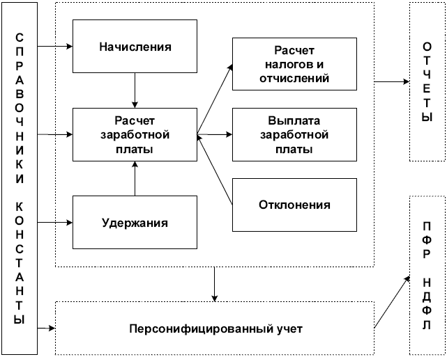 В бухгалтерии ведется учет по счетам, которые заданы в общепринятом плане счетов. На каждом счете накапливаются суммовые значения дебета и кредита, на основании их сводится баланс, подсчитывается прибыль или убыток. Естественно предположить, что подобная система существует и для ведения учета заработной платы. Подобно проводкам в бухгалтерском учете, в программе ведутся так называемые расчеты. Все расчеты делятся на начисления, удержания и отчисления в бюджет. В журналах расчетов накапливаются соответствующие данные по сотрудникам. Собственно в этом и состоит персонифицированный учет. Каждому виду расчета задается шаблон проводки в бухгалтерском учете. В программе ведется около 60 видов предопределенных расчетов. При отсутствии необходимого вида расчета, пользователю может задать свой вид расчета. К неудобствам использования пользовательских видов расчетов мы вернемся в главе 4 .