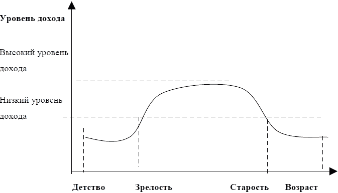 3) старость. Это этап когда наши потребности не столь разнообразны, но изысканны. Если мы осуществляли накопления на предыдущей стадии жизни, т. е. заботились о светлом будущем или копили на черный день, мы не почувствуем определенных перемен в уровне нашей жизни.