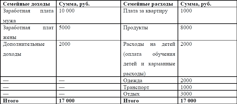 В графе «Семейные доходы» обобщаются показатели, характеризующие состояние финансов, а в графе «Семейные расходы» — показатели, характеризующие источники образования тех же самых семейных финансов.