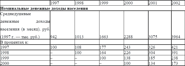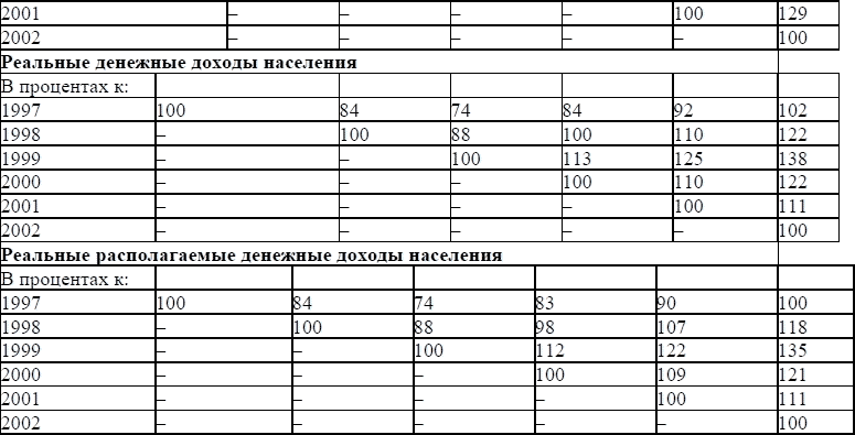 Из проводимых исследований и сравнения реальных и номинальных доходов населения наглядно видно, что рост номинальных доходов значительно опережает рост реальных доходов. Это связано с высоким уровнем инфляции — ростом цен на товары и услуги, вызывающим обесценение денег. Инфляция измеряется индексом цен на потребительские товары и услуги, т. е. инфляция — это среднее изменение цен на данные товары и услуги за определенный период времени (неделю, месяц и т. д.). От роста уровня инфляции страдает все население, но в большей степени — социально незащищенные слои населения и бюджетники.