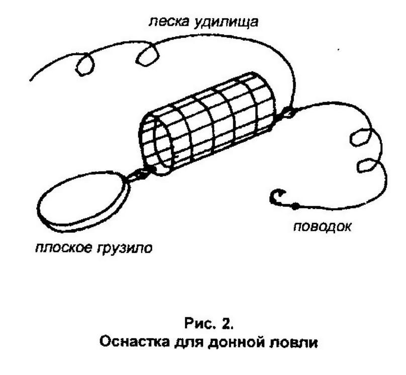Оснастка для донной ловли на реке в районе бровки достаточно проста по устройству и состоит из следующих элементов: плоского грузила, сетчатой кормушки и поводка с крючком (рис. 2).