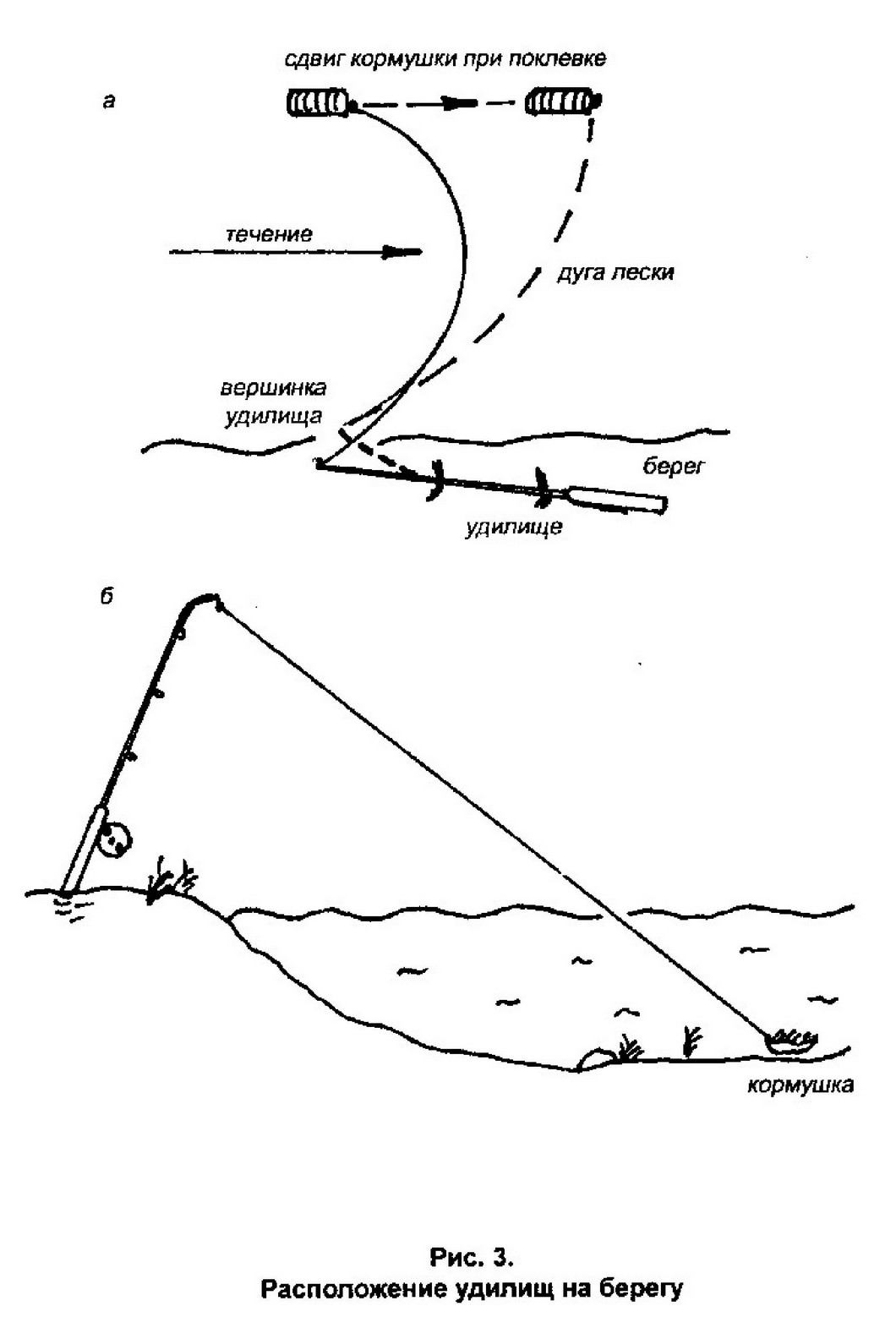 Как только оснастка «обоснуется» на дне, удилище кладут на подставки так, чтобы оно располагалось параллельно поверхности воды, вершинкой против течения (рис. 3-а). Затем следует немного подмотать леску до тех пор, пока вершинка слегка согнется. Теперь можно тем или иным способом подвесить колокольчик и ждать поклевки.