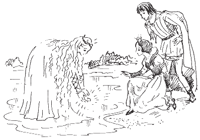 Фея Серебряного Озера стояла на воде, лёгкая и прекрасная. Её лицо, одежда были прозрачны, и лучи солнца играли в её серебристых волосах.
