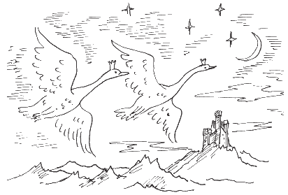 — Какие прекрасные лебеди! — воскликнул старый король Унгер. — Но почему такая жгучая тоска вдруг сжала сердце? Верно, потому, что я не знаю, где теперь моя любимая дочурка и её супруг, принц Теодор.