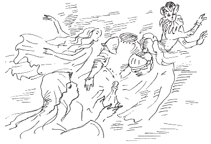 В тот же миг Белоснежку и принца Теодора окружила толпа привидений. Их шаги были неслышны, тела прозрачны. Одни, словно умоляя о помощи, робко протягивали руки, другие в великой печали роняли прозрачные слёзы.
