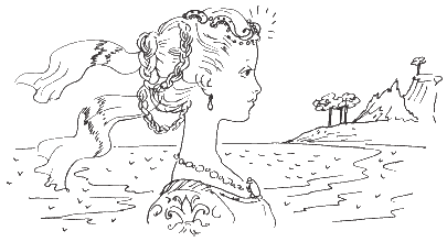 Вдруг Белоснежка почувствовала, что по её шее стекают прохладные струйки. Каждая жемчужинка ожерелья превратилась в каплю воды. В руки Белоснежки упала маленькая раковина. Послышался тихий журчащий шёпот. Створки раковины открылись сами собой. Оттуда могучим потоком хлынула голубая озёрная вода.